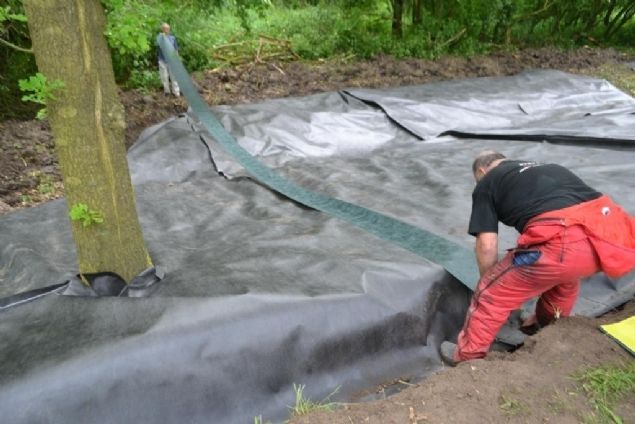 Uitdaging in het aanbrengen van het doek zijn plekken rondom bomen, waar het lastig is het doek mooi “duizendknoopdicht” te maken. Om het doek zo goed mogelijk om de boom te leggen, krijgt deze een soort rubberen kraag (nog niet te zien op de foto). Als de plant nog ergens opduikt, dan zal het op deze plekken zijn vertelt Zweers. Maar als er een enkele keer een stengel opduikt, is dat niet zo’n probleem, die kan de aannemer in zijn rondgang wel weghalen en veilig afvoeren.