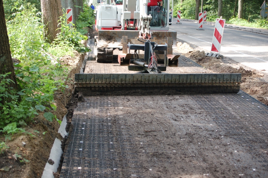 Nowadays, this method is mainly used to protect tree roots. Landmark trees significantly impact the climate and biodiversity, and we want to preserve them. If the soil is not disturbed (which is undesirable as it causes root damage) and the compaction remains around 2 MPa, it is possible to construct a foundation that can even support heavy traffic. Fire trucks, grab lorries, and agricultural vehicles must also be able to pass. However, it is crucial that water and oxygen can still reach the roots. Experience has shown that when a root zone is covered with a sealed surface, the soil underneath dries out, and the tree enters a negative spiral. By making the foundation wider than the bike path, gas and water exchange can still occur.