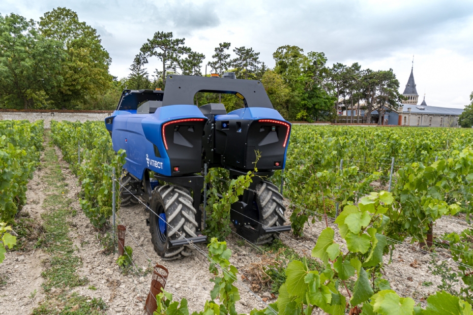 There is also considerable activity in viticulture in terms of robotization. For example, the German Robot Makers developed a robot that autonomously drives through the vineyard and mows the grass. The machines are built based on customer demand. A low center of gravity makes the machine suitable for working on serious slopes. The French Vitirover also builds an autonomously driving machine for mowing narrow paths in viticulture, fruit cultivation, and tree cultivation. The 20 kilo heavy 4wd machine works with a roughly 30 centimeter wide lawn mower-like mowing unit and drives a maximum of 300 meters per hour. In viticulture, one machine per hectare is sufficient. VitiBot in Reims, France, is also active in this market. Since 2015, the goal of this company has been to deploy its Bakus technology for sustainable viticulture. VitiBot has two types of vineyard robots: one for narrow and one for wide inter-rows. The robots autonomously hoe in the rows and even between the vines.