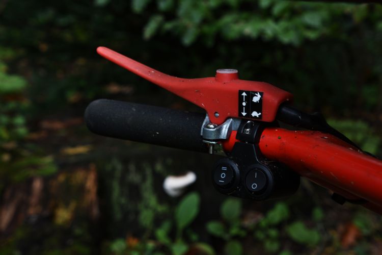 Zandijk: "We don't bring it for every little branch, but if needed, it goes on our trailer for chipping work in private gardens. Because it's self-propelled, fairly narrow, and agile, you can easily drive it to the work area. Steering is smooth with the handlebar mounted beneath the intake. That handlebar also lets you set the desired driving speed and shows you the remaining battery charge. In our case, that's sufficient. We only charge the two 12V batteries when necessary, once we're back at the shed. Charging takes about four and a half hours."