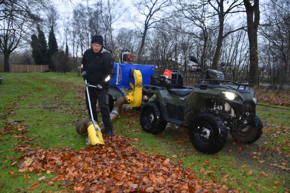 A colleague of Averesch, Roy, is collecting leaves from the grassy areas of the wooded site. He's blown the fallen leaves into rows, which he's now vacuuming up with a compact leaf vacuum system. The leaves pass through a 20 cm-wide intake nozzle and a five-metre flexible hose into a vacuum shredder.