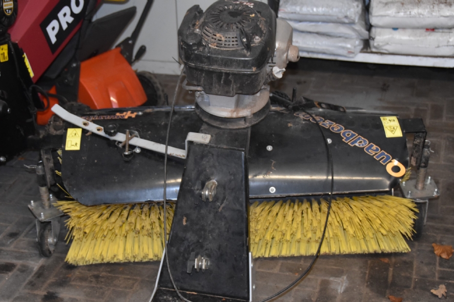 This mini leaf vacuum trailer can also be used to clear other debris, like clippings from the many hedges. It's easy to hitch and unhitch. The same goes for the 120 cm-wide powered sweeper brush that mounts on the front of the quad. It, too, is powered by a similar Honda four-stroke engine.