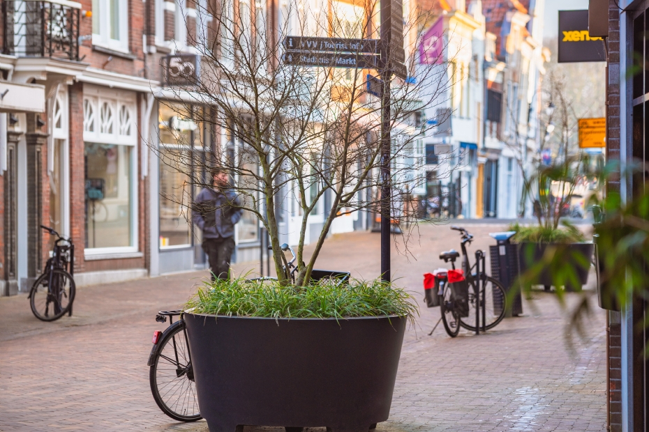 "Like Dordrecht, where we also recently placed mobile planters, the city centre of Gouda is highly urbanised," says Meloen. "The municipality wants to make the centre greener and organised evening meetings with local entrepreneurs to discuss it. They opted for planters because there is a dense infrastructure beneath the paving. The planters couldn't be too small (they would be lost in the streetscape), but also not too large, because emergency services require at least 3.5 meters of clearance." The planters stand on feet and are easy to move. "We also offer bottomless planters and prefer to plant directly in the ground, but we understand that isn't always possible due to infrastructure. They also need to be removable during events."