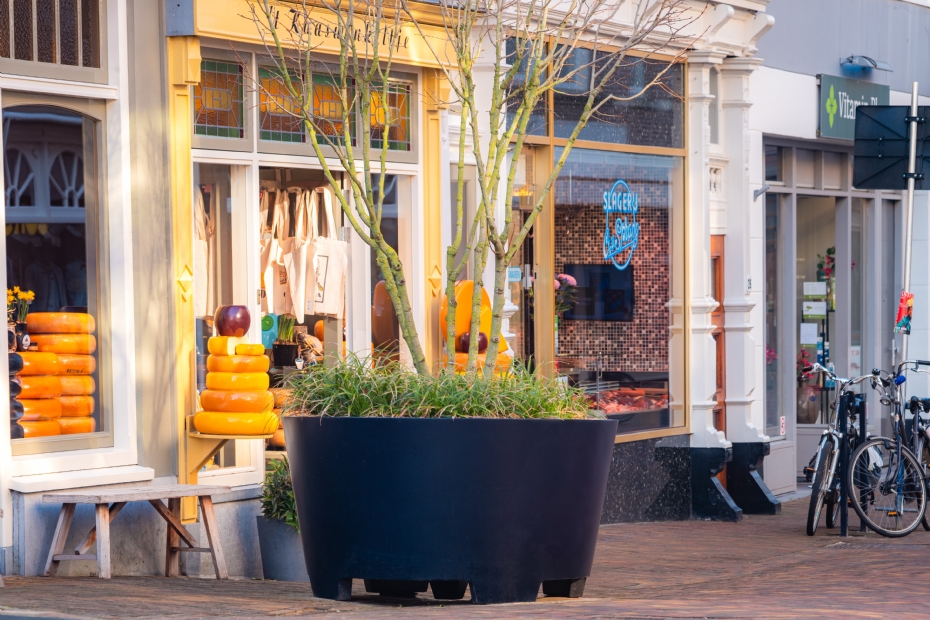 "Siep van Jaarsveld, project leader for the Public Space Project, explained that the municipality was looking for suitable options. After the selection process, our company came out on top. People from the municipality saw conical planters on our website—a round shape, 1,500 mm in diameter and 800 mm in height. They chose aluminum, powder-coated in a dark blue-black color. In Lange Tiendeweg, new paving stones had just been laid in various colors: red, sand, brown, and dark grey. They wanted something to match that." The planters taper downward; they are wider at the top than at the base. The round shape also ties in well with the circular plastic cheeses found all over Gouda's streets and canals. "Gouda has so far placed ten planters in the city centre, and two more are still to be installed. The municipality ordered twelve in total."