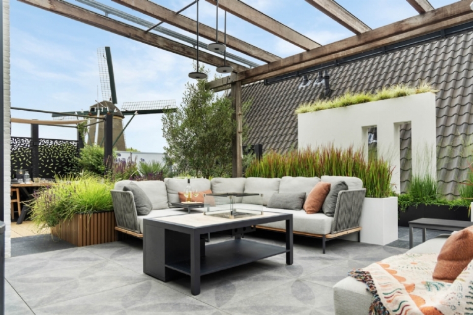 According to Groenendijk, the view is a major asset for the residents, but it also presented a challenge for Groenregie. The roof opposite needed to be screened from sight, while maintaining clear sightlines to the buildings on either side. The terrace had to offer sufficient openness while retaining an intimate and sheltered atmosphere, allowing residents to enjoy the surroundings in full privacy. The existing fencing was supplemented with black pole walls, aluminium design panels, and stucco-look walls. These stucco-look walls feature vertical openings and are topped with ornamental grasses and ambient lighting. "The pergolas with aluminium louvres also contribute to a sense of seclusion, without being overpowering," says Groenregie.