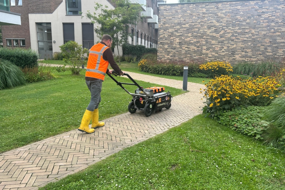 A recent application of the eWeeding Roller was in the courtyard garden of the residential complex Avenue 1895 in Arnhem. Van Viegen explains that this garden is located directly on top of a parking garage and is irrigated through an underground system. 'Underneath the paving and planting is a permeable lava layer. Due to the limited construction height and its location above a heated space, the temperature in the subsoil is relatively high. This creates a favorable growth climate - also for unwanted vegetation. Especially grasses come up through the paving.' But that turns out not to be a problem for the eWeeding Roller. It is also effective here in controlling growth, without modification of the machine or burden on the subsoil.