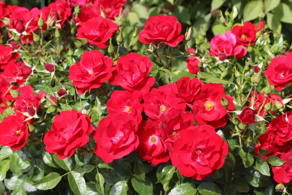 Shrub rose from Kordes with semi-double, deep velvety red flowers. The yellow stamens contrast nicely with the dark flower colour. The flowers have a light fragrance and self-clean well. Reaches a height of 80 to 140 cm.