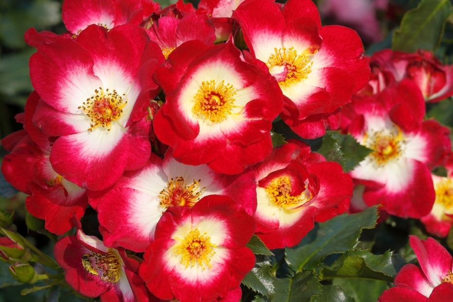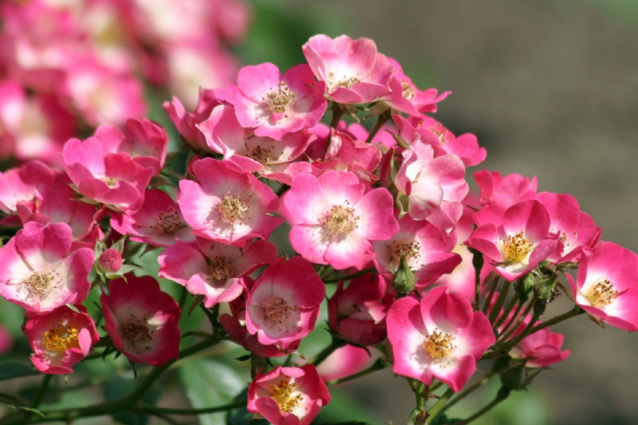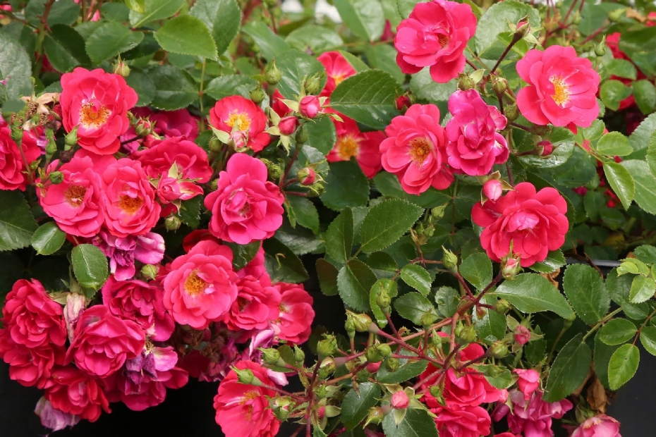 Loki ('Tan16512'): Bushy-growing floribunda rose from Rosen Tantau. The bright pink, single flowers have a white centre and striking dark yellow stamens. Lightly fragrant and self-cleaning. In autumn, round hips appear that change from green to orange. Height between 50 and 100 cm.