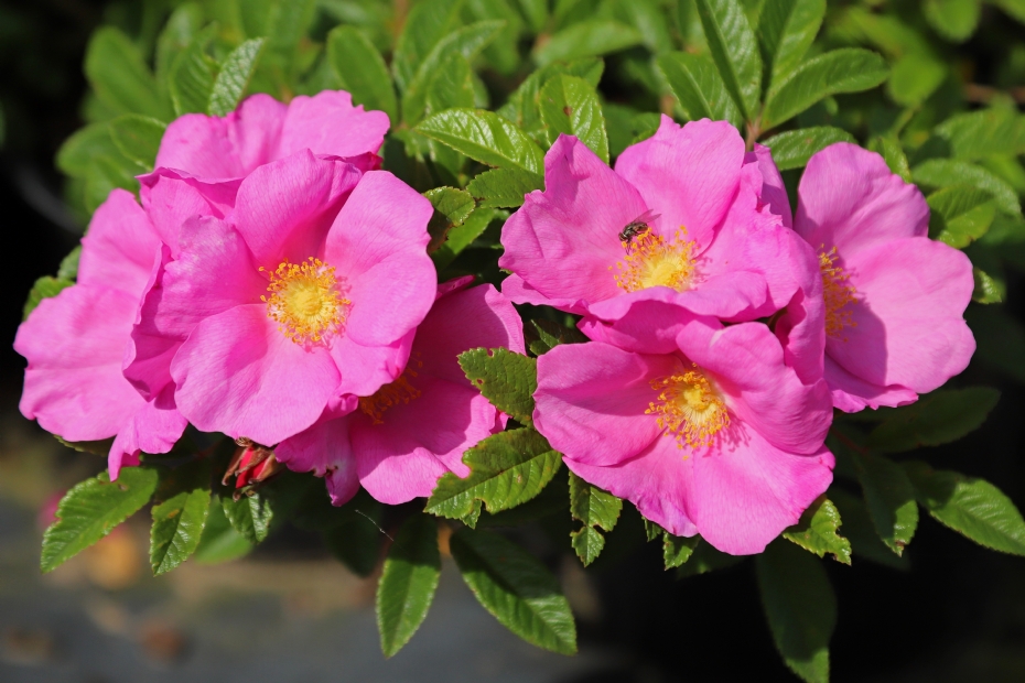 Although this rose from Viva International is classified as a ground cover rose/shrub rose, the height at different locations ranged from 60 to 130 cm. The deep pink, slightly double flowers fade to lilac-pink. The striking yellow stamens provide strong contrast, and the calyxes of the spent flowers remain visually prominent. After flowering, small hips develop that stay green for a long time and later turn orange.