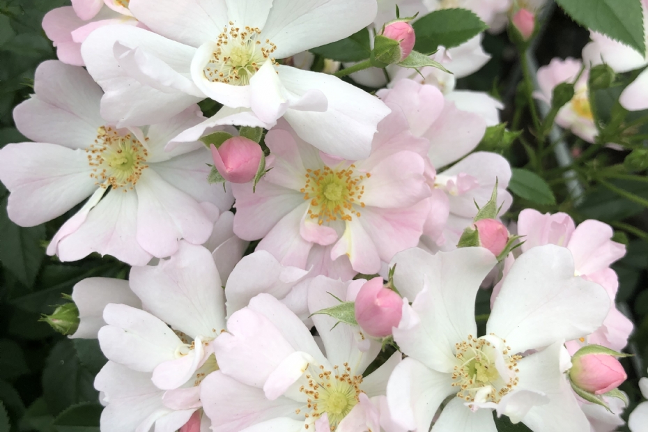 This patio rose from Kordes achieved the highest number of points among the new Excellence Roses. The flower buds are lilac/pink, and the single flowers are light pink, fading to white. The striking dark yellow stamens add ornamental value. Flowers self-clean well. After flowering, green hips form that later turn orange-red. Height is 30 to 55 cm.