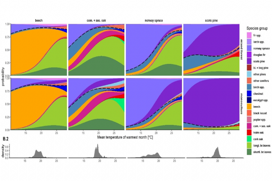 The graph above shows the change in composition of young trees as maximum monthly temperature increases in Central Europe. For example: top row: 'Norway spruce'. A shift from 15 to 20 degrees already results in a change in forest regeneration from mainly spruce and birch to a much more mixed regeneration of spruce, birch, beech and other broadleaf species. In a monoculture (bottom row), regeneration remains much more limited to a single conifer species, with Norway spruce and Scots pine dominating.