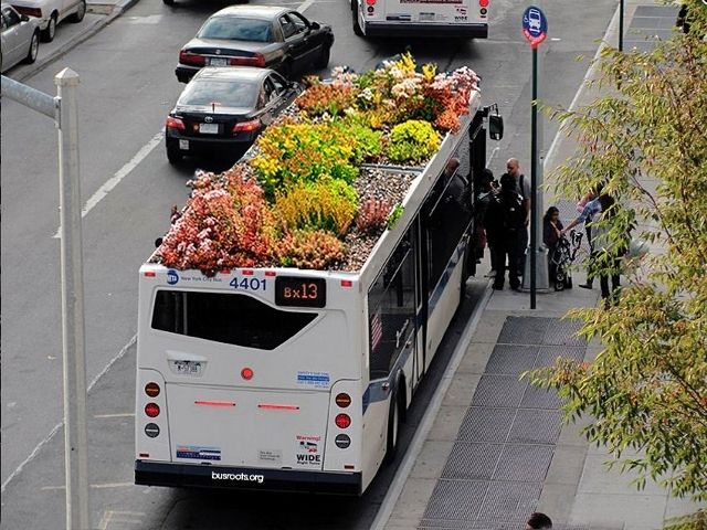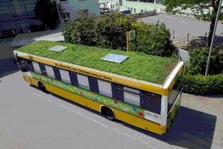 Dak- & gevelgroen laat zich wel eens lastig verkopen, omdat het vaak op plaatsen ligt waar niet iedere consument het meteen ziet. Wilco van Dreumel van de firma Bauder leverde ons deze foto, die gemaakt werd van een bijzonder aangeklede stadsbus in Stuttgart. Stuttgart is de stad waar zich het hoofdkantoor van Bauder gevestigd is. Om te vieren dat in 2011 85 jaar stadsbussen door Stuttgart rijden werd deze bus uitgerust met een opvallend stuk dakgroen. Het idee is niet nieuw. De New Yorkse designer Marco Castro Cosio stelde in 2010 al eens voor om de daken van alle bussen in de stad te vergroenen. Dit zou een aangeplante oppervlakte opleveren van ongeveer 14 hectare. Cosio maakte een prototype (onderstaande foto) om aan te tonen dat het werkt.