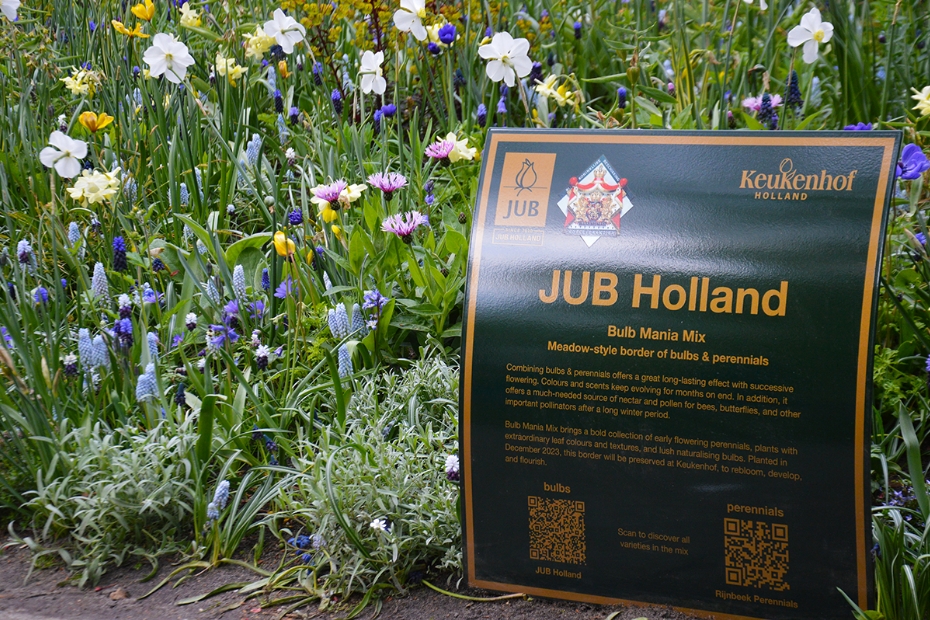 The team from JUB Holland, one of Keukenhof's original contributors, regularly brings clients and contacts from the Netherlands and abroad to Keukenhof throughout the season. Robbert Uittenbogaard reflects: "A visit to the park has become a fixed part of our JUB Study Days and offers an excellent opportunity to present new ideas like this mixed border, spark discussion, and gather feedback. Our clients, and we ourselves too, were positively surprised by the early flowering, the unique leaf textures, and the wide variety. The Bulb Mania Mix forms a lovely combination with our own Indigo design, which is located right next to it. It offers inspiration to our clients and Keukenhof visitors for their own garden and landscape projects. We've even already received the first requests for ten-square-metre Bulb Mania Mix packs, which we will be developing together."