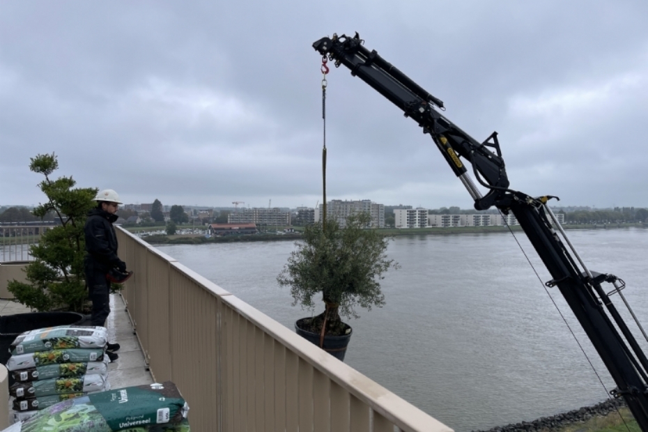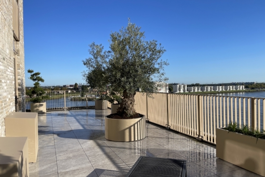 The planting on the rooftop terrace features an old olive tree as the central element, complemented by a large fig tree and lower-growing Carex plants. On the river side, two holly specimens and a large false holly (Osmanthus) have been planted. Nearly all of the planting is evergreen, ensuring the terrace remains green throughout the year. All planters are equipped with a Gardena micro-drip irrigation system that automatically waters the plants during dry periods.