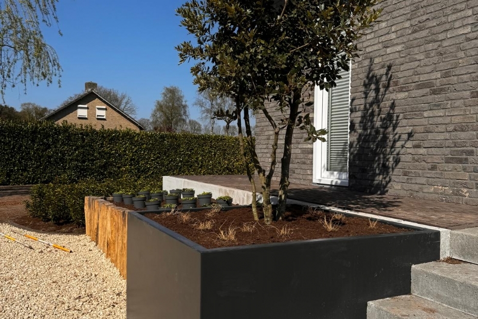 'For us, this garden was definitely a challenge, as elevation changes are not common in this part of central Limburg. You see them more often in southern Limburg,' Van der Asdonk says, smiling. Retaining walls were installed as part of the design. 'We ordered a planter from Adezz, a company from Uden that we've worked with for over ten years and have had good experiences with. Adezz has a wide product range, and the standard planters integrate easily into our designs. Custom products are also available. I appreciate that Adezz can deliver quickly because they manufacture everything in-house — the deliveries are reliable.'