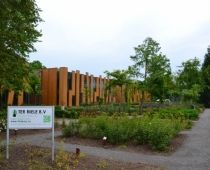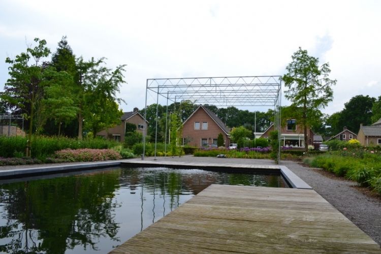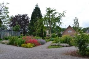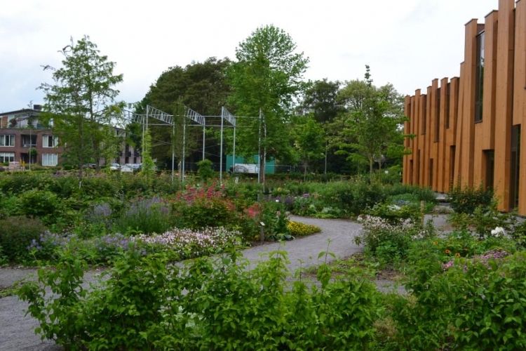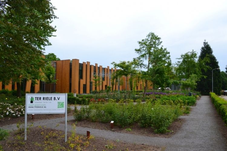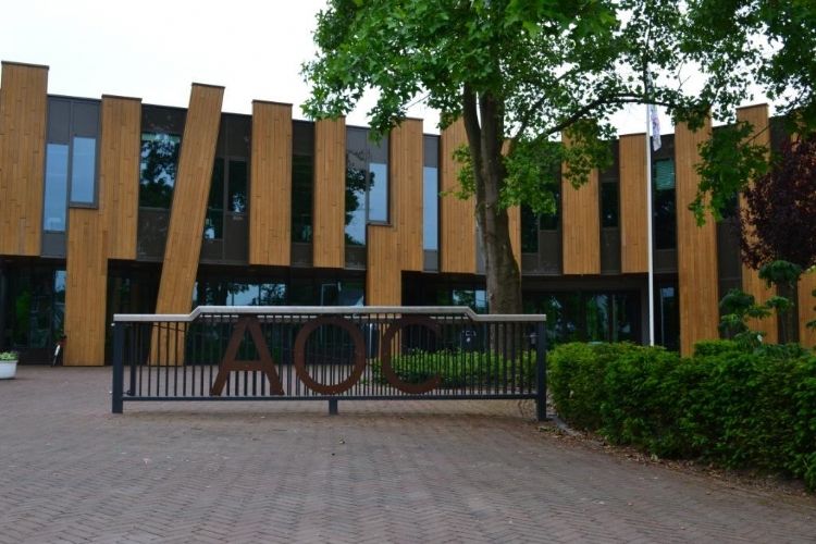 Complete buitenterrein inrichting van VMBO en MBO college AOC te Twello. Assortimentstuin, Uniek Gebouw, Leerlingen betrokken bij project, beeldbepalend in omgeving.